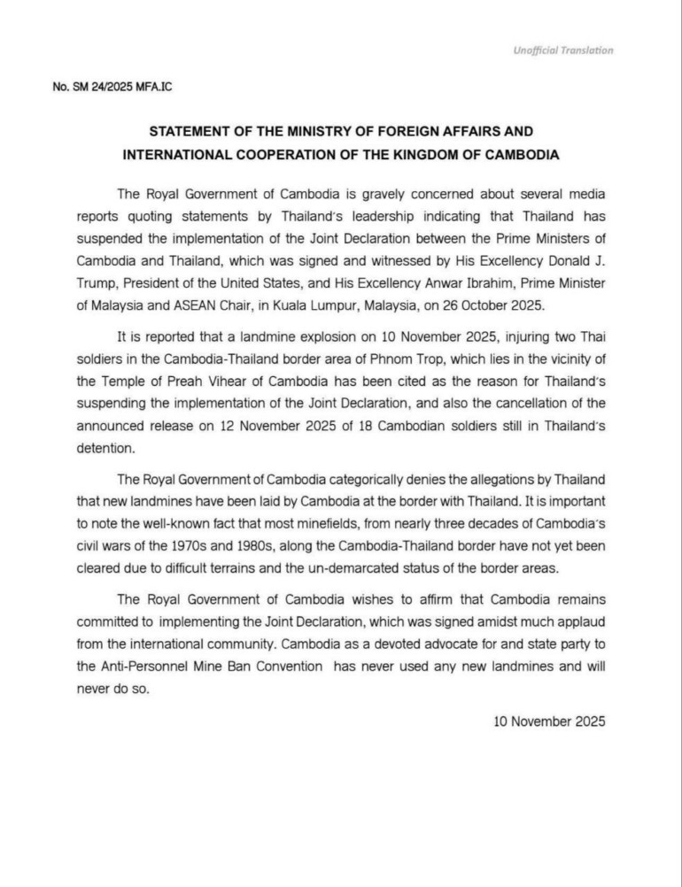 គួរបញ្ជាក់ថា នាយករដ្ឋមន្ត្រីថៃ លោក Anutin Charnvirakul កាលពីថ្ងៃអង្គារ បានប្រាប់ឱ្យក្រសួងការពារជាតិផ្អាកទាំងអស់ នូវការអនុវត្តតាមកិច្ចព្រមព្រៀងសន្តិភាពជាមួយកម្ពុជា ដោយមិនមានកាលកំណត់នោះ ហើយថែមទាំងប្រកាសទៀតថា សន្តិភាពបានបិទបញ្ចប់ហើយ នៅពេលនេះ៕